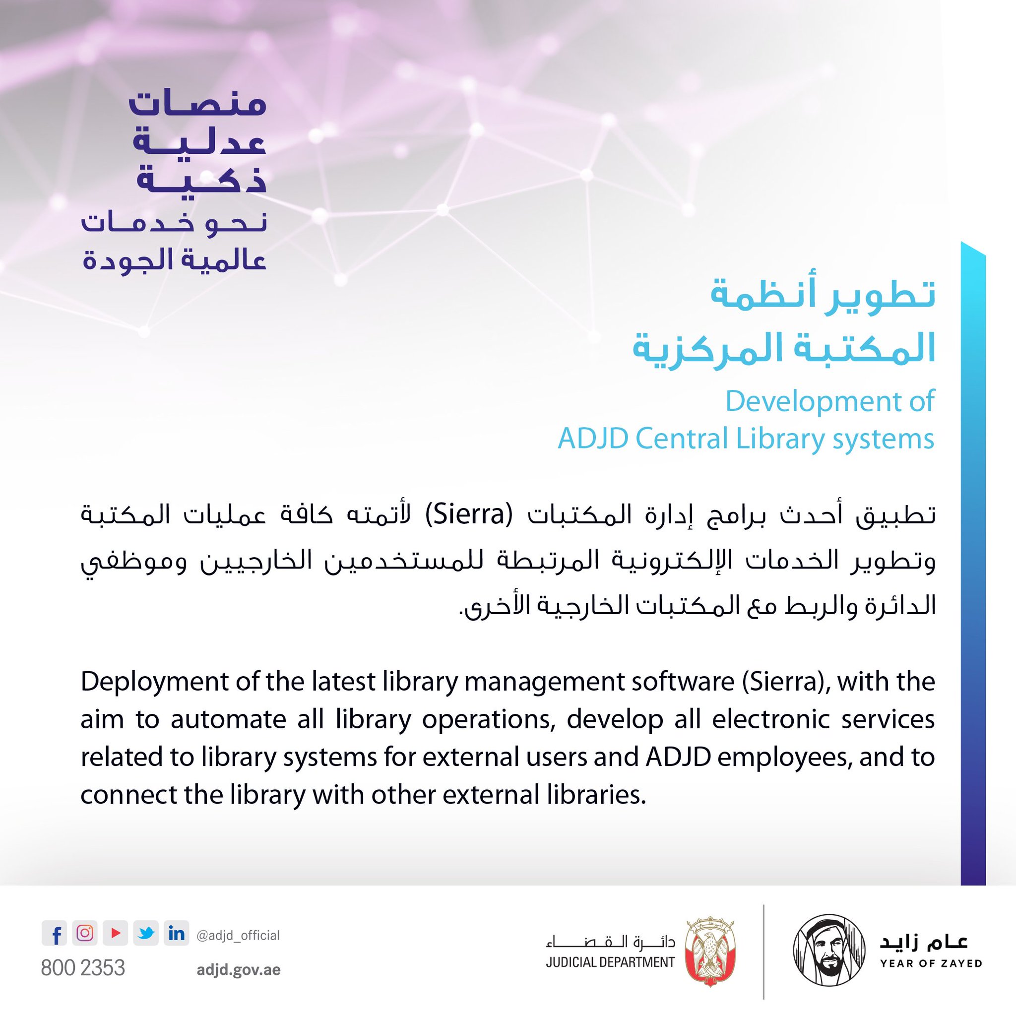 دائرة القضاء أبوظبي On Twitter يهدف المشروع إلي تطبيق أحدث برامج إدارة المكتبات Sierra لأتمتة كافة عمليات المكتبة وأيضا تطوير كافة الخدمات الإلكترونية المرتبطة للمستخدمين الخارجيين وموظفي الدائرة والربط مع المكتبات الخارجية Adgitex2018